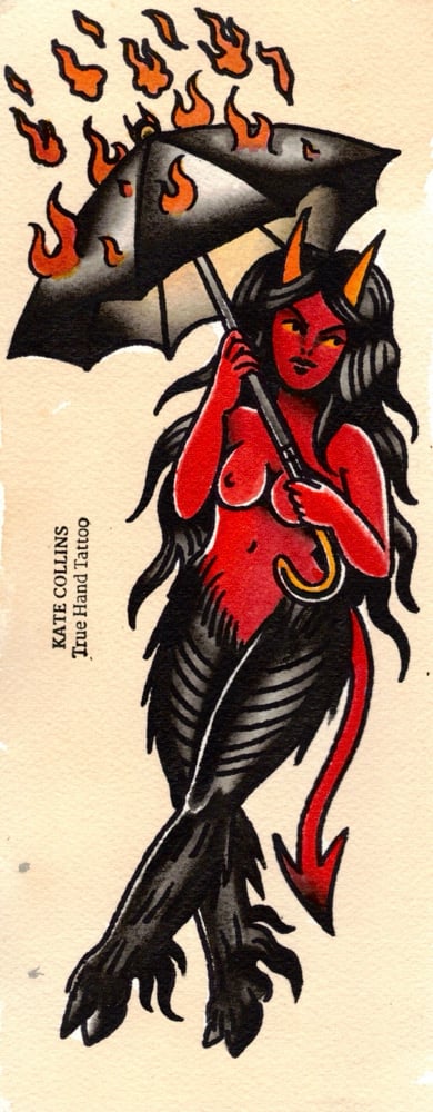 A looooong print, 5x11 inches, of a devil babe holding an umbrella as it lightly rains flames in hell 😊 Printed on archival watercolor paper.