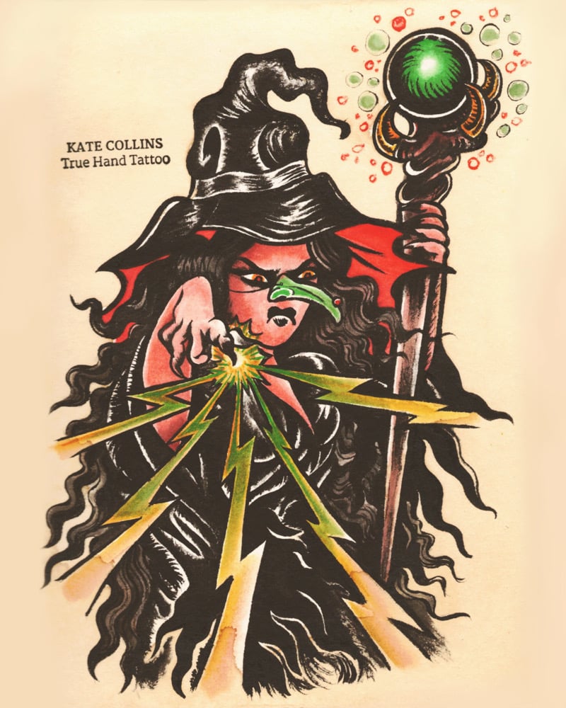5x7 or 8x10 inch archival watercolor print of a witch in a classic tattoo wizard pose!